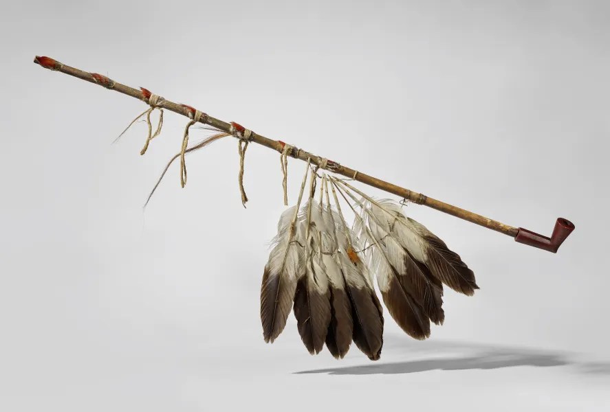 Calumet. Bois, pierre, plumes d’aigle, piquants de porc-épic, bec de pic-vert, laine © musée du quai Branly – Jacques Chirac, photo Pauline Guyon
